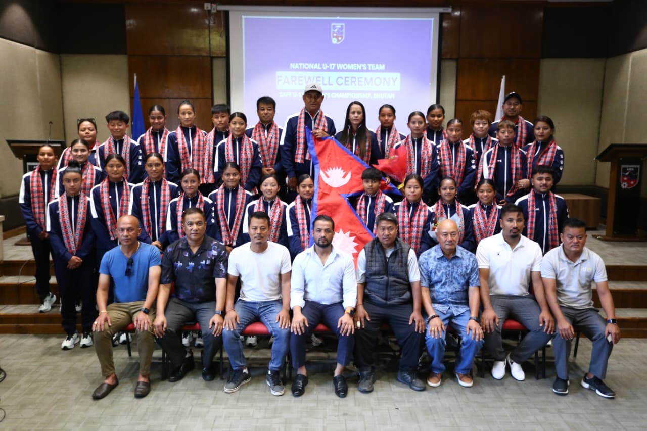 भुटानमा आयोजना हुने साफ यू–१७ महिला च्याम्पियनसिपमा सहभागी हुने नेपाली टोलीलाई बिदाइ गरिएको छ ।  साफ यू–१७ महिला च्याम्पियनसिपमा उत्कृष्ट प्रदर्शन गर्ने लक्ष्य राखेको प्रशिक्षक तथा कप्तानले बताएका छन् ।  यही भदौ ४ गतेदेखि १५ गतेसम्म भुटानमा साफ यु–१७ महिला च्याम्पियनसिप २०२५ आयोजना हुँदैछ ।
