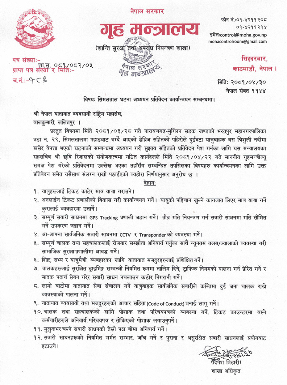 मन्त्रालयले बुधबार यातायात व्यवसायी राष्ट्रिय महासङ्घलाई पत्र लेख्दै सिमलताल घटना अध्ययन प्रतिवेदनको सुझाव कार्यान्वयन गर्न भनेको छ । २८ असारमा नारायणगढ–मुग्लिन सडक खण्डको भरतपुर–२९, सिमलतालमा गएको पहिरोले दुई वटा यात्रुवाहक बस त्रिशूली नदीमा खसालेर बेपत्ता पारेको घटनाबारेको अध्ययन प्रतिवेदनका विषयहरू कार्यान्वयन भन्दै यस्तो निर्देशन दिइएको हो ।