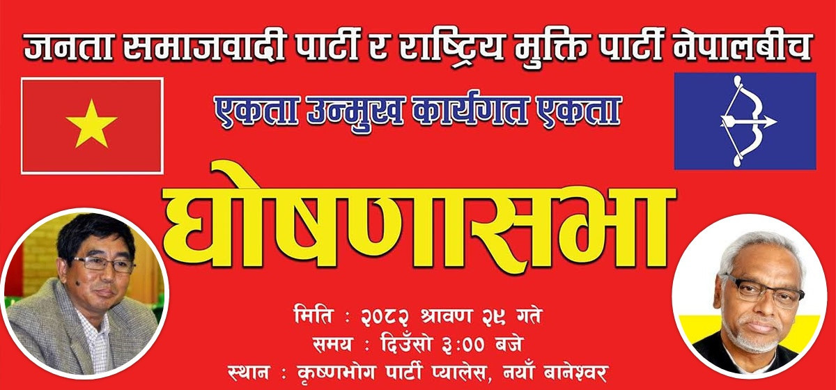 अशोक राई नेतृत्वको जनता समाजवादी पार्टी र राजेन्द्र महतो नेतृत्वको राष्ट्रिय मुक्ति पार्टी नेपालबिच बिहीबार कार्यगत एकता गर्ने घोषणा हुँदै छ।