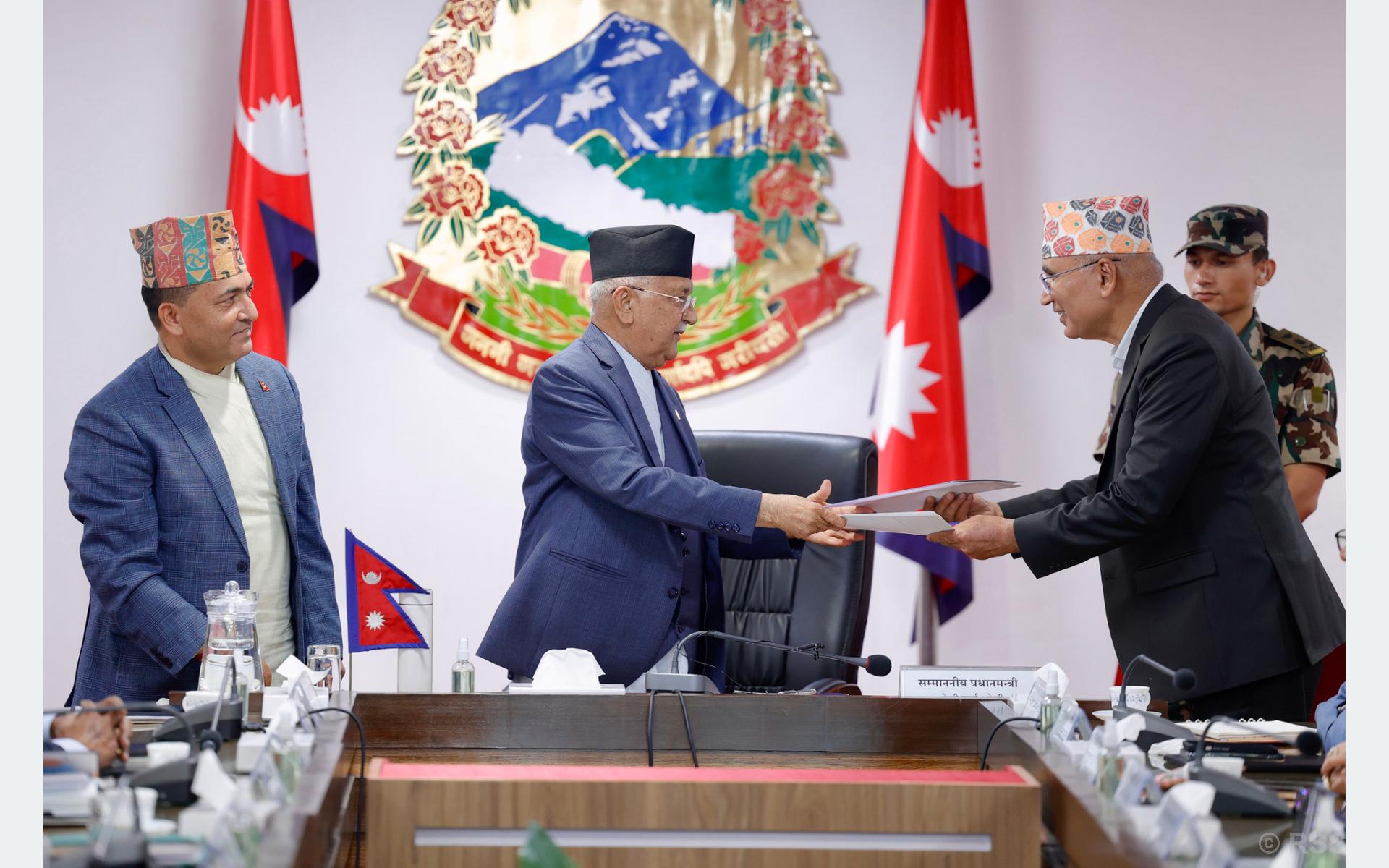 प्रधानमन्त्री केपी शर्मा ओलीसँग चालु आर्थिक वर्षमा गरिने मुख्य काम र हासिल हुने उपलब्धिका लागि उपप्रधानमन्त्रीद्वय, मन्त्री र मुख्यसचिवहरुबीच आज कार्यसम्पादन सम्झौता भएको छ ।