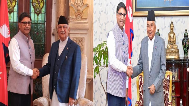 ३. विदेश सचिवले हिजो नेपालका सम्माननीय राष्ट्रपति श्री रामचन्द्र पौडेल र सम्माननीय प्रधानमन्त्री श्री केपी शर्मा ओलीसँग शिष्टाचार भेटवार्ता गर्नुभयो । दुवै राष्ट्रपति तथा प्रधानमन्त्रीलाई भारतका नेतृत्वको तर्फबाट शुभकामना व्यक्त गर्दै वहाँले दुई देशबीचको द्विपक्षीय सहकार्यका विविध पक्षहरुमा भइरहेको प्रगतिका बारेमा पनि जानकारी गराउनुभयो ।